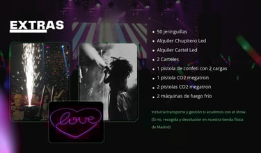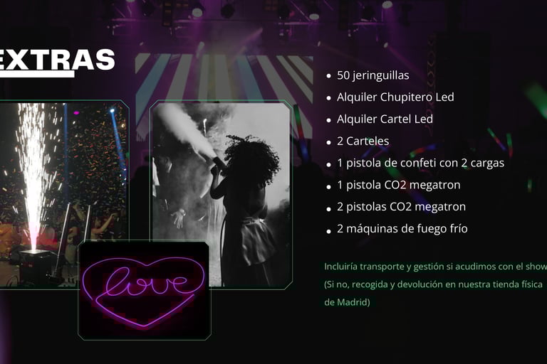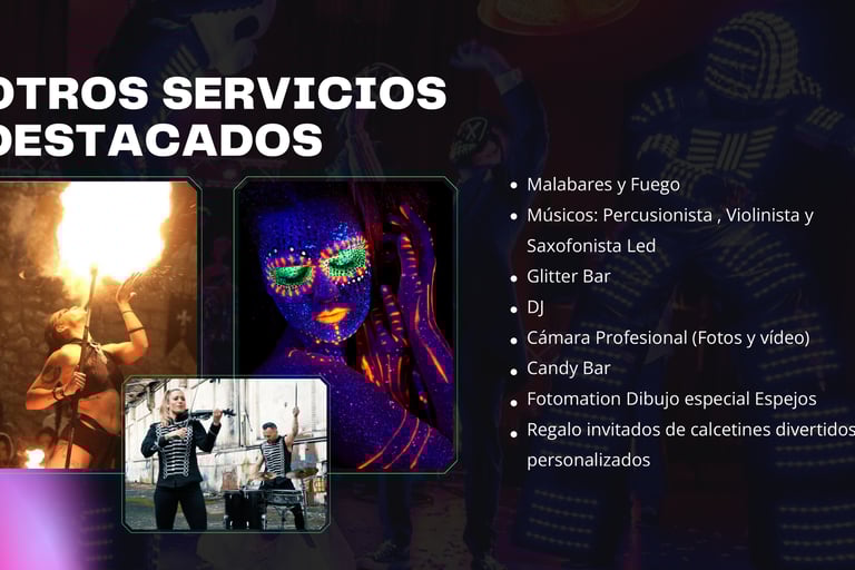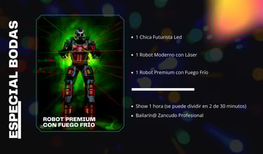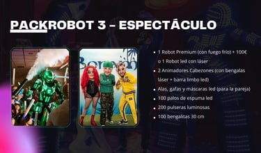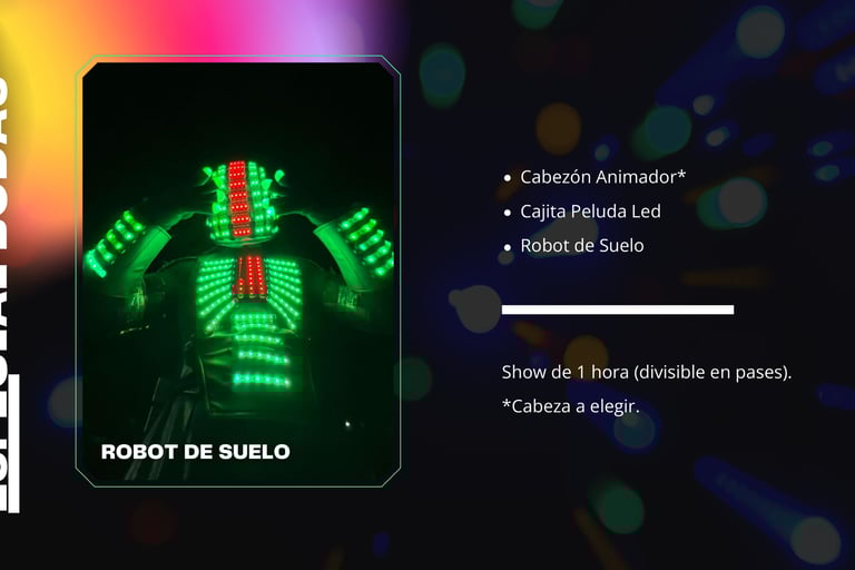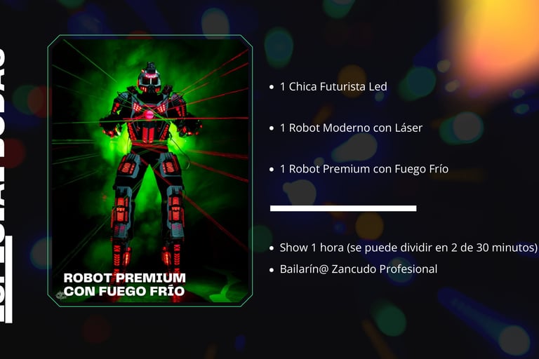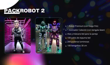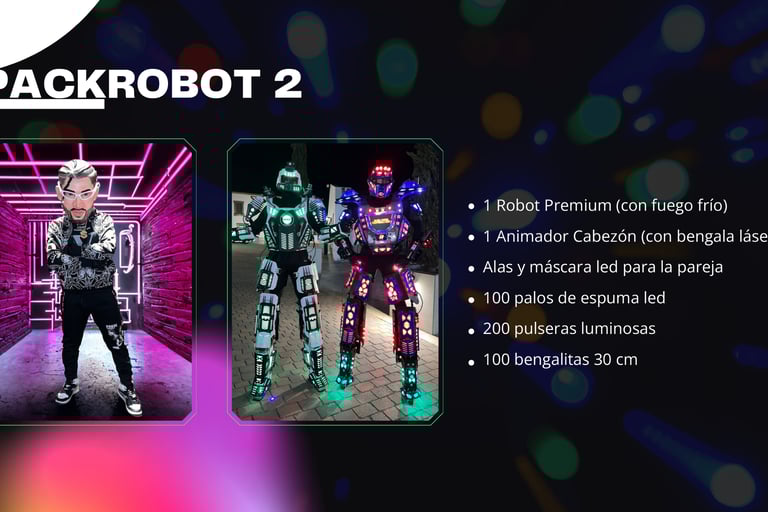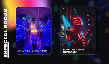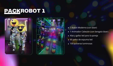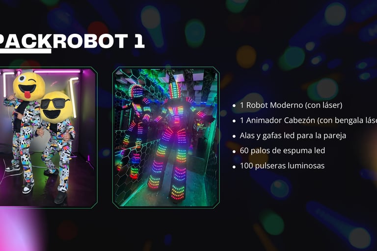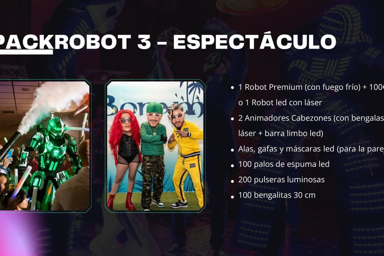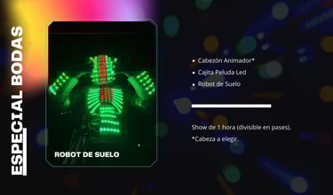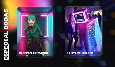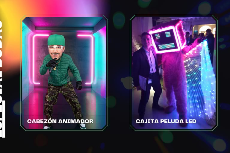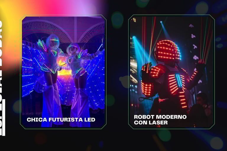 Imagina a tus invitados sorprendidos y emocionados mientras disfrutan de un espectáculo sin igual. Contamos con shows impresionantes que incluyen robots LED que iluminan la pista de baile, cabezudos de personajes famosos que harán reír a todos, caretas y disfraces espectaculares que transportarán a tus invitados a un mundo de fantasía, y pistolas de CO2 para añadir un toque de adrenalina.
